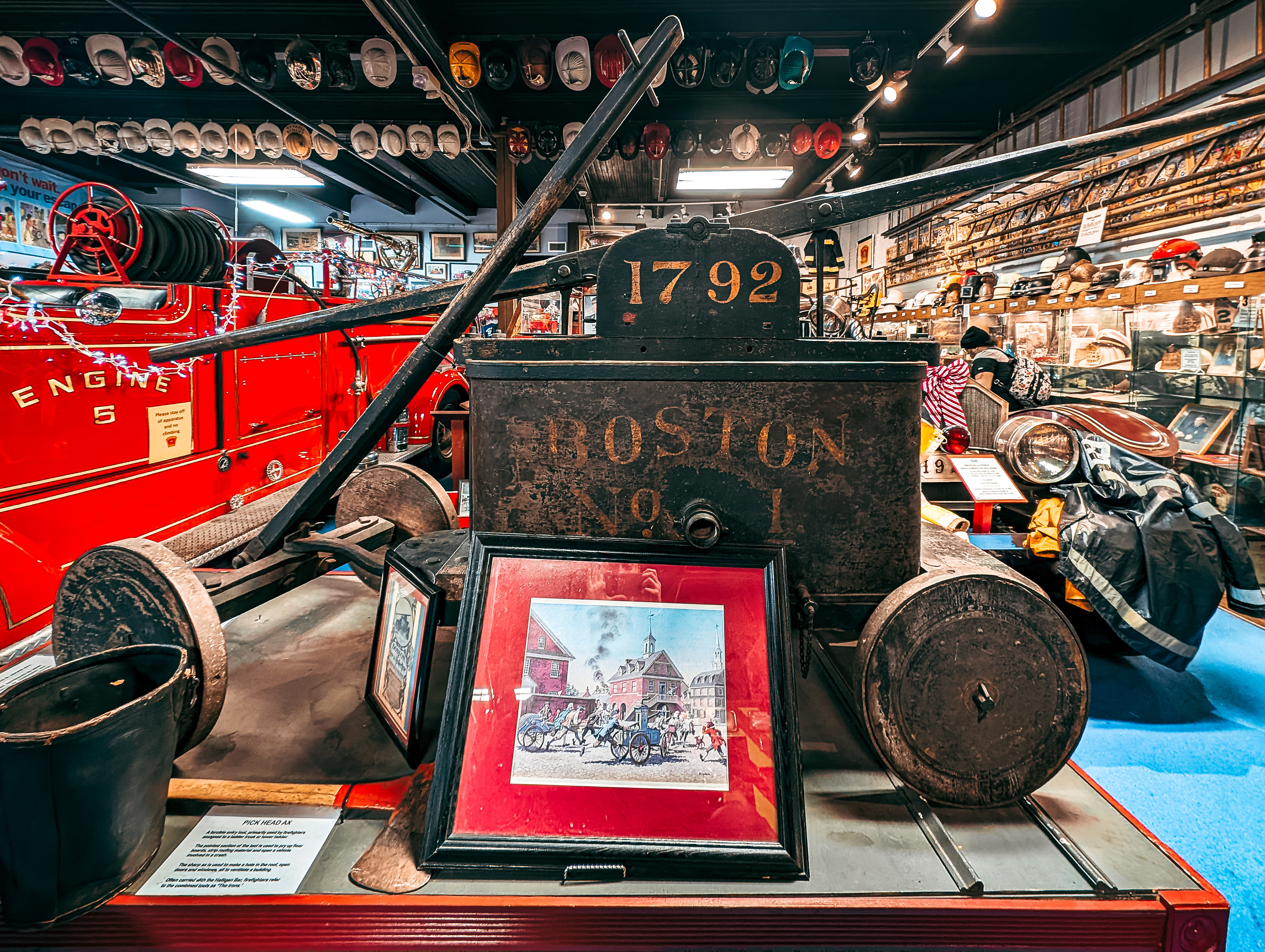 It’s pretty common for visitors at the Boston Fire Museum to stop in front of this late 18th-century piece and wonder the question posed above. Some-20 people surrounded Boston No. 1, known as “The Thayer,” a hand tub fire engine built in 1792. According to the museum, it was crafted by Ephraim Thayer (an apprentice of Paul Revere) at Revere’s brass foundry.